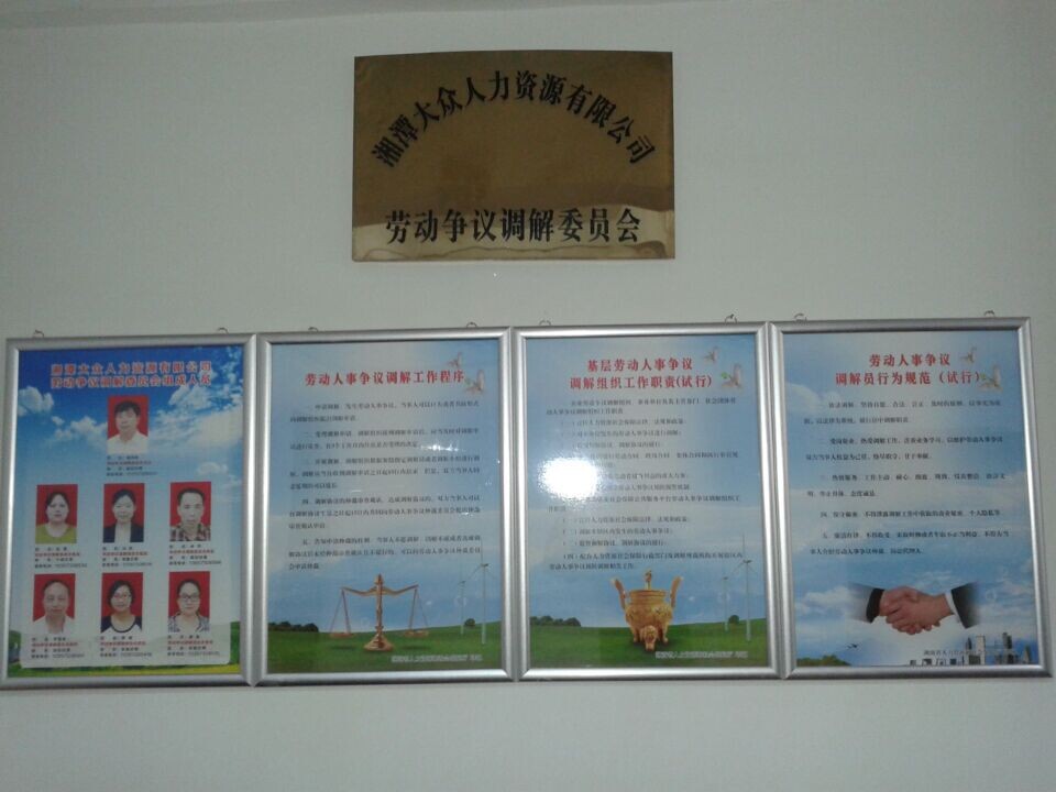 為了規(guī)范勞動(dòng)人事?tīng)?zhēng)議預(yù)防調(diào)解處理工作,維護(hù)社會(huì)和諧穩(wěn)定,按照潭人社發(fā)【2014】29號(hào)文件要求,根據(jù)《中華人民共和國(guó)勞動(dòng)爭(zhēng)議調(diào)解仲裁法》等法律法規(guī)精神,湘潭大眾人力資源有限公司于2014年6月13日調(diào)整規(guī)范了勞動(dòng)爭(zhēng)議調(diào)解委員會(huì),并對(duì)委員會(huì)成員、工作程序、工作職責(zé)、行為規(guī)范進(jìn)行了上墻公示。