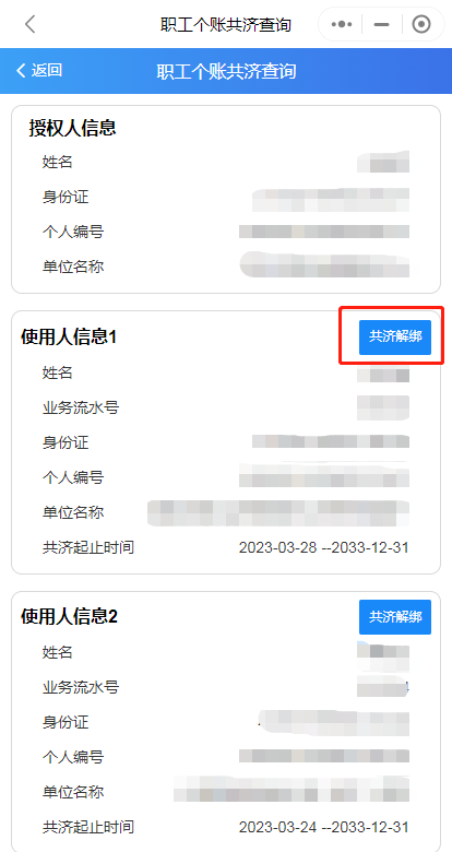 第四步:辦理完成后,可通過“家庭共濟”——“共濟關(guān)系查詢解綁”查詢綁定情況,“解除綁定”功能也可在此界面操作。