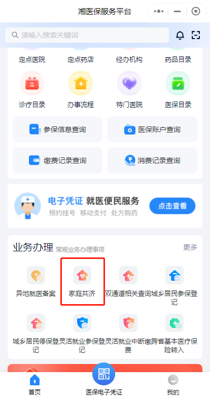 第一步:下載“湘醫(yī)保”App,或進入“湘醫(yī)?!盇pp小程序,登錄后在首頁“業(yè)務(wù)辦理”中找到“家庭共濟”,點擊“共濟申請”。